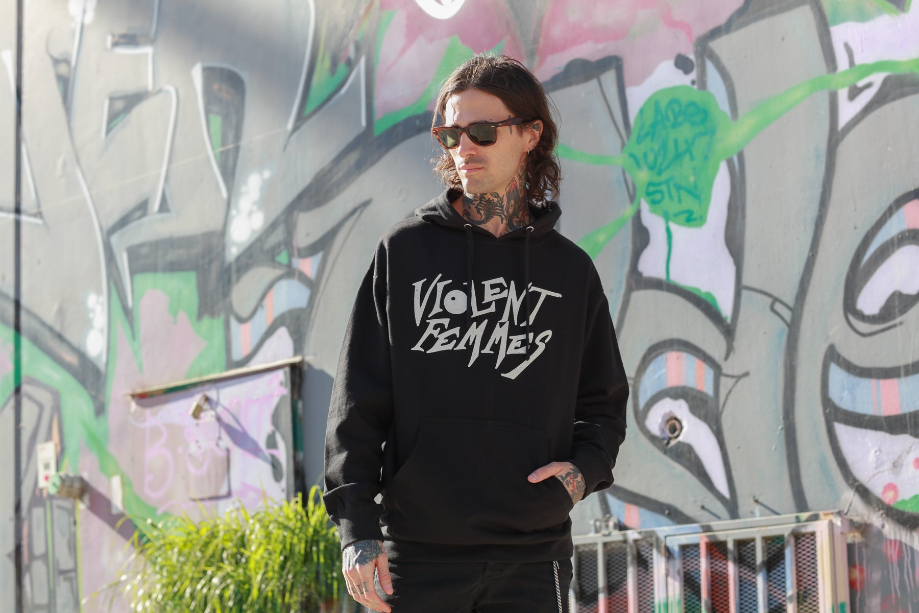 The Violent Femmes Distressed Stinky Logo design, printed on a comfortable, standard-fitting black pullover hoodie.